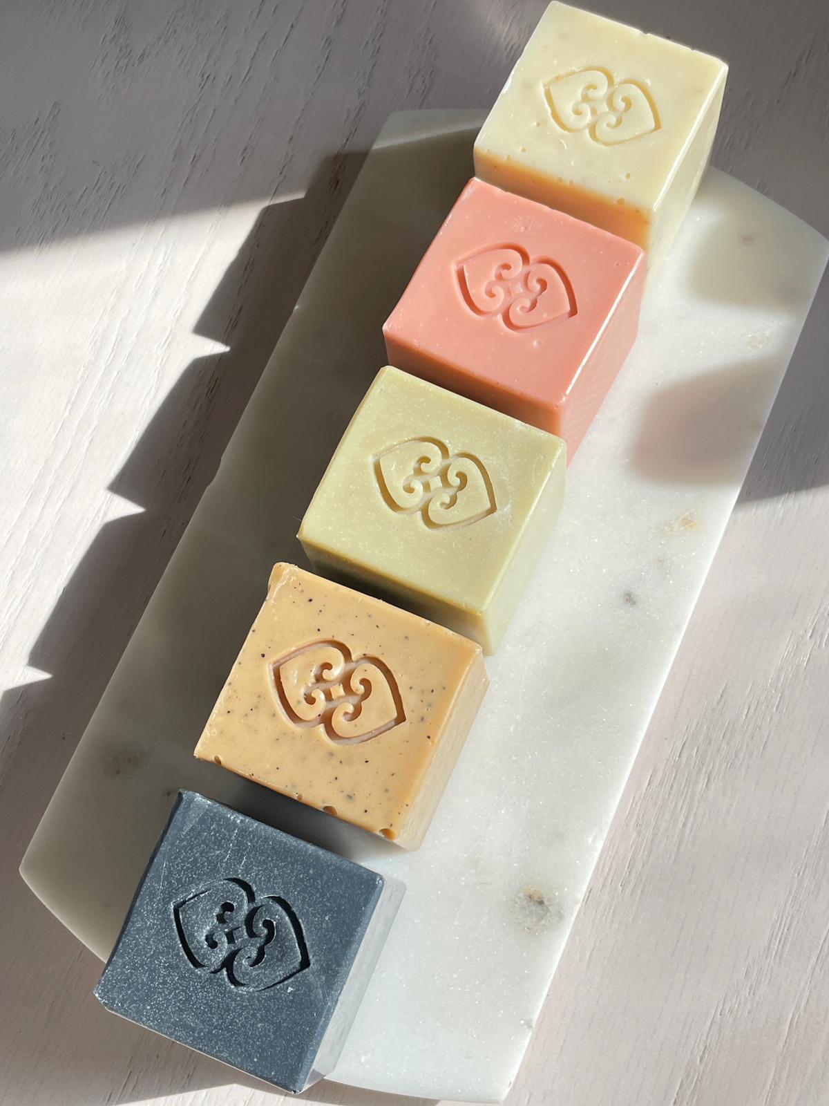 We believe in simple and sustainable ingredients inspired by the motherland to help you create an intentional shower experience. Our soap cubes are handcrafted in small batches using high quality skin-loving ingredients including shea butter sourced from Ghana. We use a cold process soap-making method in which soap cubes cure for a minimum of 4-6 weeks before they make it to your bathroom to enjoy!